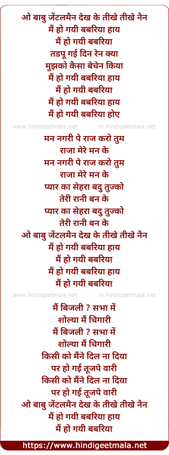 Lyrics of O Babu Gentleman Dekh Ke Tikhe Tikhe Nain - ओ बाबु जेंटलमैन देख के तीखे तीखे नैन
