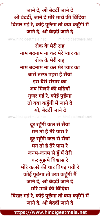 Lyrics of O Bedardi Jaane De - जाने दे, ओ बेदर्दी जाने दे