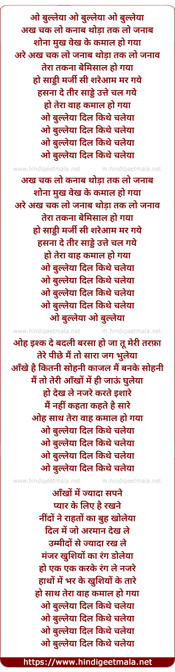 Lyrics of O Bulleya Dil Kithhe Challeya - ओ बुल्लेया दिल किथे चल्लेया