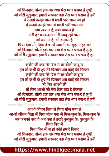 Lyrics of O Diladaar Bolo Ik Baar Kyaa Meraa Pyaar Pasand Hai Tumhen - ओ दिलदार, बोलो इक बार क्या मेरा प्यार पसन्द है तुम्हें