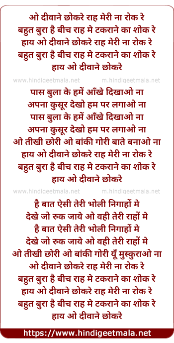 Lyrics of O Diwane Chhokre Rah Meri - ओ दीवाने छोकरे राह मेरी