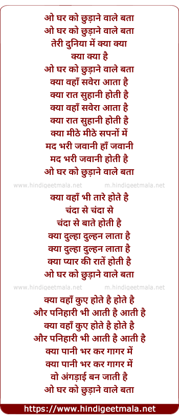 Lyrics of O Ghar Ko Chhodne Wale Bata - ओ घर को छुड़ाने वाले बता