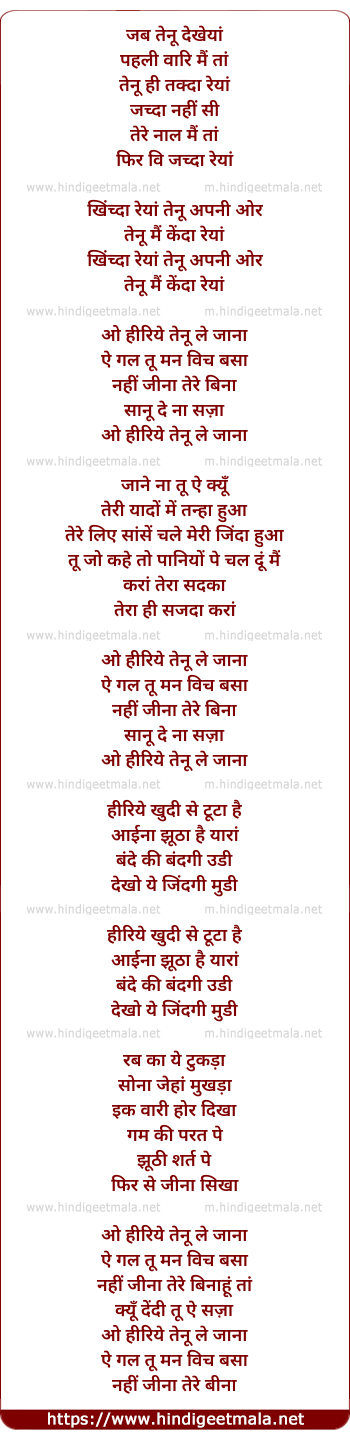 Lyrics of O Heeriye Tenu Le Jaana - ओ हीरिये तेनू ले जाना