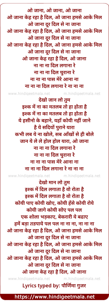 Lyrics of O Jaana Kah Raha Hai Dil, O Jaana - ओ जाना कह रहा है दिल , ओ जाना