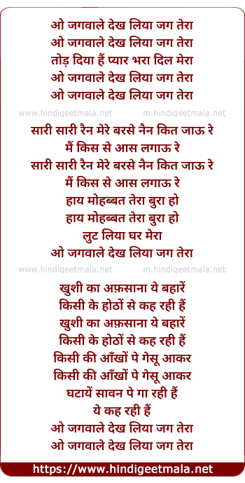 Lyrics of O Jagwale Dekh Liya Jag Tera - ओ जगवाले देख लिया जग तेरा