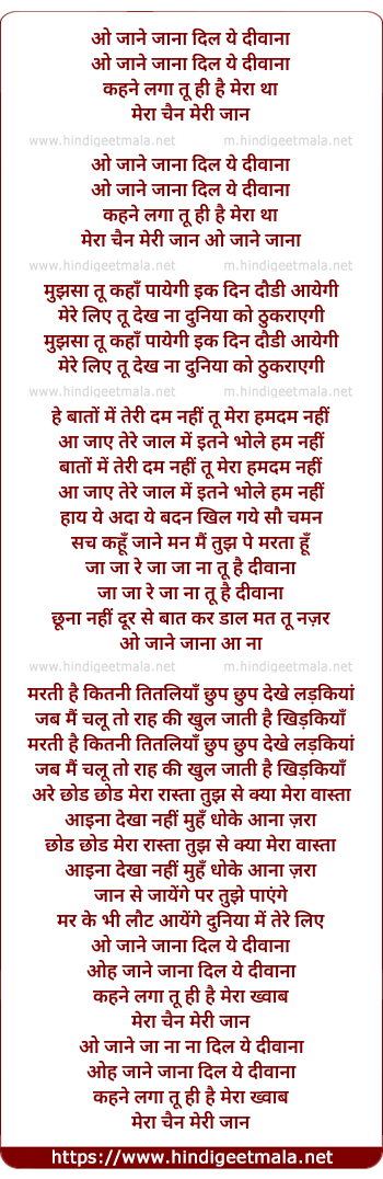 Lyrics of O Jane Jaana Dil Ye Diwana - ओ जाने जाना दिल ये दीवाना