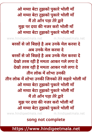 Lyrics of O Maiya Beta Tujhko Pukare - ओ मय्या बेटा तुझको पुकारे