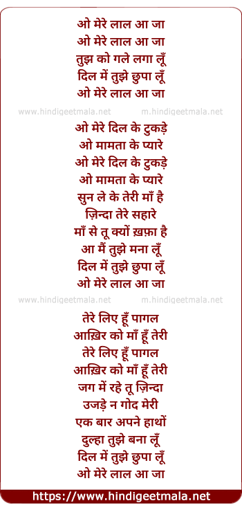 Lyrics of O Mere Laal Aa Ja, Tujh Ko Gale Laga Lu - ओ मेरे लाल आ जा, तुझ को गले लगा लूँ