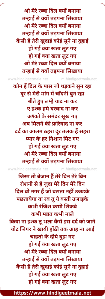 Lyrics of O Mere Rabba Dil Kyun Banaaya - ओ मेरे रब्बा दिल क्यों बनाया