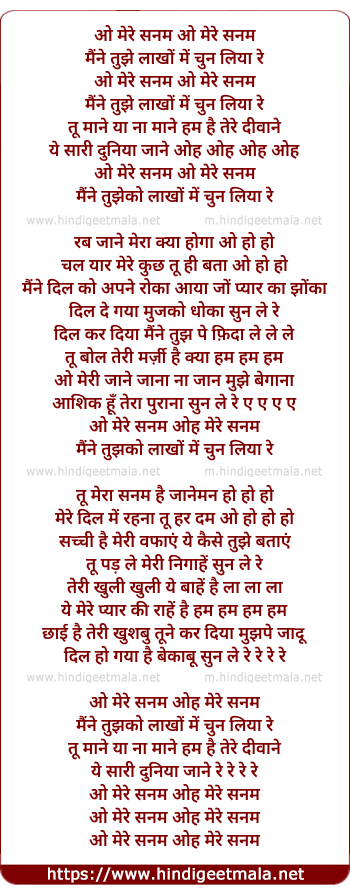 Lyrics of O Mere Sanam (Maine Tujhko Lakhon Me Chun Liya Re) - ओ मेरे सनम (मैंने तुझेको लाखों में चुन लिया रे )