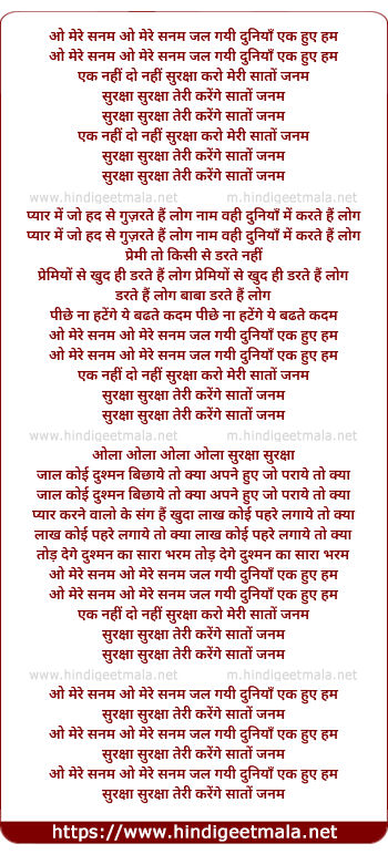Lyrics of O Mere Sanam, Jal Gayi Duniya Ek Hue Hum - ओ मेरे सनम, जल गयी दुनियाँ एक हुए हम