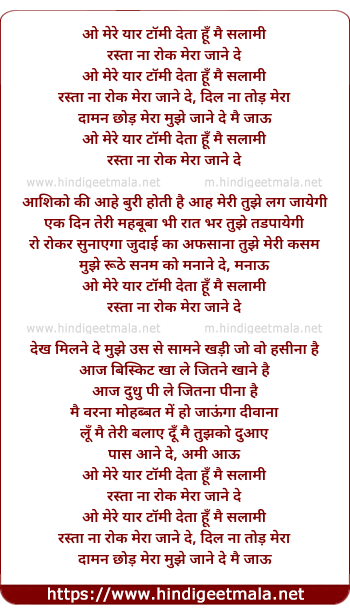 Lyrics of O Mere Yaar Tommy Deta Hu Mai Salami - ओ मेरे यार टॉमी देता हूँ मै सलामी