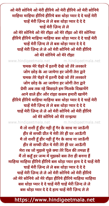 Lyrics of O Meri Soniye, O Meri Hiriye - ओ मेरी सोनिये, ओ मेरी हीरिये