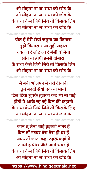 Lyrics of O Mohana Na Ja Radha Ko Chhod Ke - ओ मोहना ना जा राधा को छोड़ के