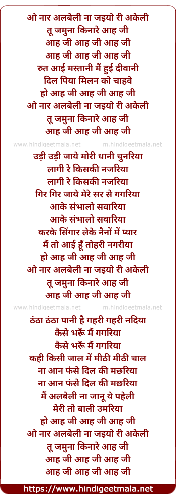 Lyrics of O Naar Albeli Na Jayiyo Ri Akeli - ओ नार अलबेली ना जइयो री अकेली