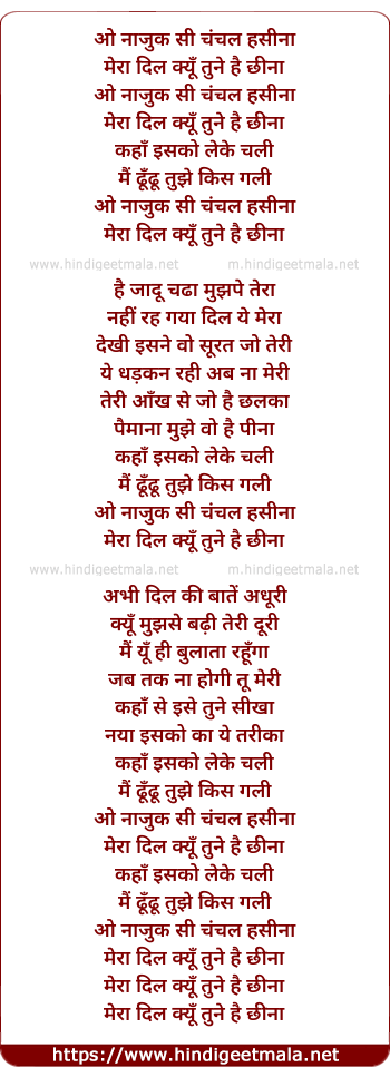 Lyrics of O Nazuk Si Chanchal Haseena - ओ नाजुक सी चंचल हसीना