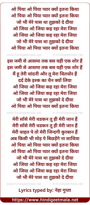 Lyrics of O Piya O Piya Pyar Kyo Itna Kiya - ओ पिया ओ पिया प्यार क्यों इतना किया