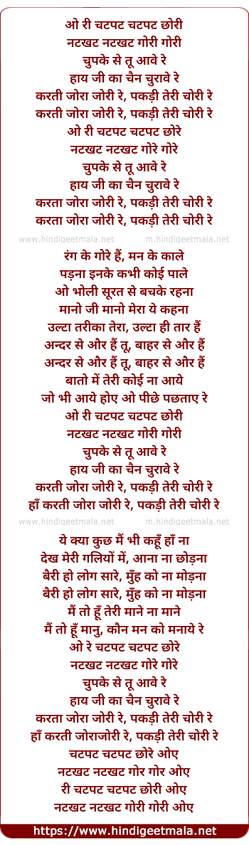 Lyrics of O Ri Chatpat Chatpat Chhori - ओ री चटपट चटपट छोरी