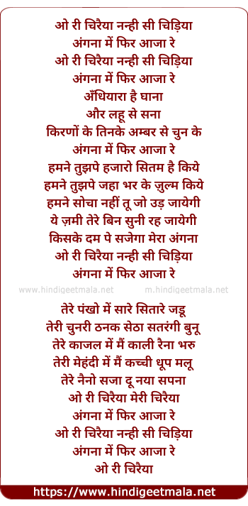 Lyrics of O Ri Chiraiya Nanhi Si Chidiya - ओ री चिरैया नन्ही सी चिड़िया