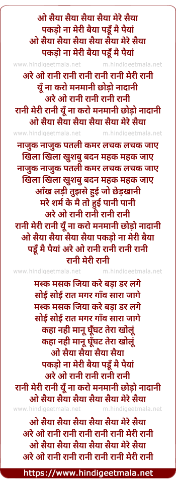 Lyrics of O Saiyan Saiyan Mere Saiya - ओ सैया सैया मेरे सैया