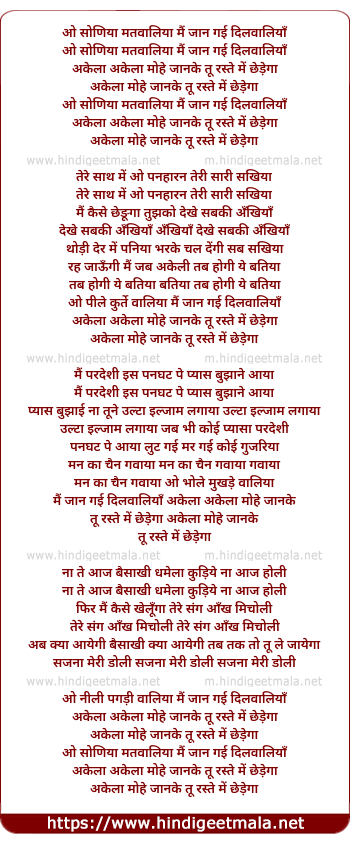 Lyrics of O Soniya Matwaliya Mai Jaan Gayi Dilwaliya - ओ सोणिया मतवालिया मैं जान गई दिलवालियाँ