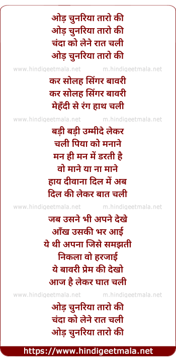Lyrics of Od Chunariyaa Taaron Ki, Chandaa Ko Lene Raat Chali - ओड़ चुनरिया तारो की चंदा को लेने रात चली