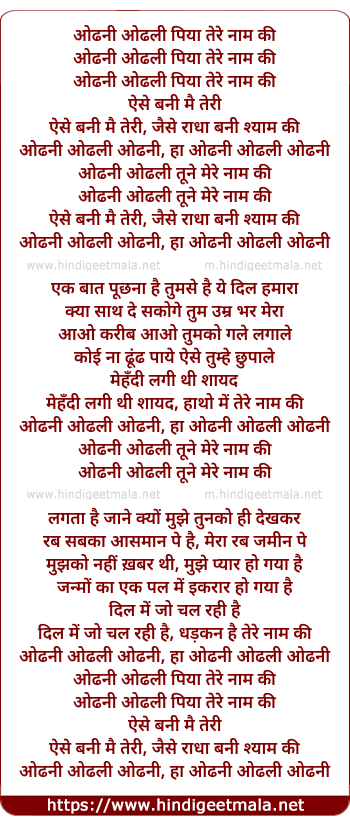 Lyrics of Odhanee Odhalee Piya Tere Naam Kee - ओढनी ओढली पिया तेरे नाम की