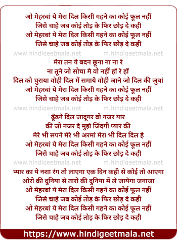 Lyrics of Oh Meherbaan Ye Mera Dil Kisi Gahne Ka Phool Nahi - ओ मेहरबां ये मेरा दिल किसी गहने का फूल नहीं