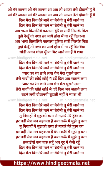 Lyrics of Oh Mere Jaanam Aa Ab To Aaja Teri Diwani Hu Mai - ओ मेरे जानम आ अब तो आजा तेरी दीवानी हूँ मैं