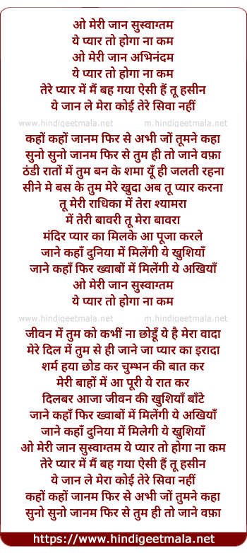 Lyrics of O Meri Jaan Suswagtam - ओ मेरी जान सुस्वाग्तम