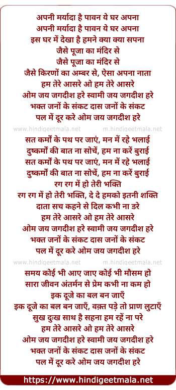 Lyrics of Om Jai Jagadish - ओम जय जगदीश