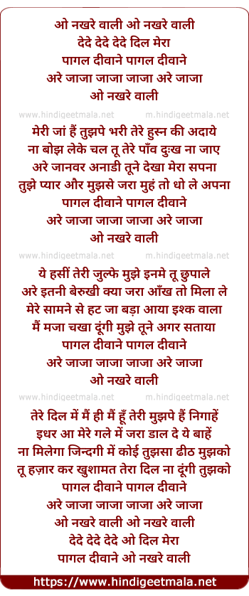 Lyrics of Oye Nakh Nakhrewali De De Dil Mera - ओ नख नखरेवाली दे दे दिल मेरा
