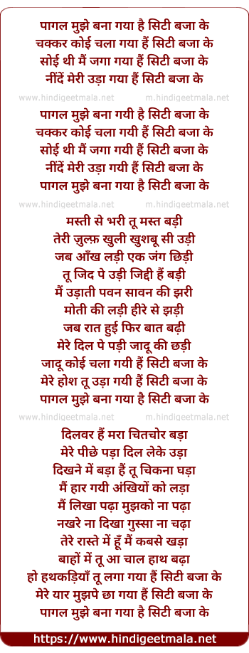 Lyrics of Pagal Mujhe Bana Gaya Hai Siti Baja Ke - पागल मुझे बना गया है सिटी बजा के