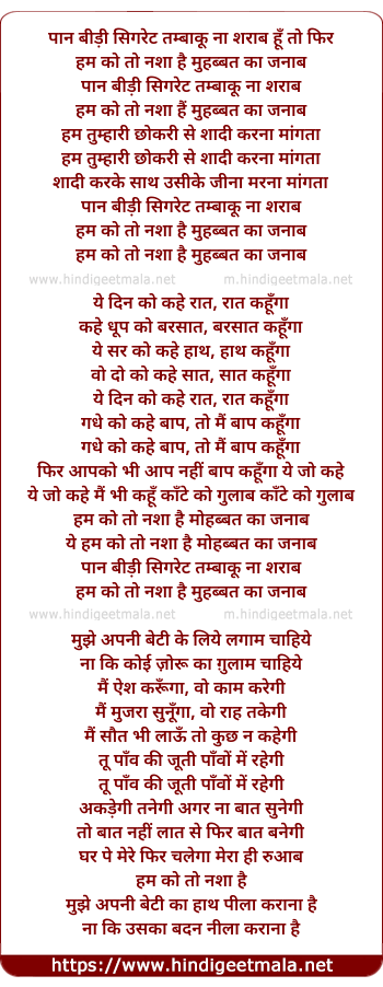 Lyrics of Paan Bidi Sigaret, Ham Ko To Nashaa Hai Muhabbat Kaa Janaab - पान बीड़ी सिगरेट, हम को तो नशा है मुहब्बत का जनाब