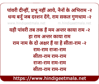 Lyrics of Paanvari Dinhin Prabhu Nahin Aaye Nainon Ke Abhiraam - पांवरी दीन्हीं, प्रभू नहीं आये, नैनों के अभिराम -२