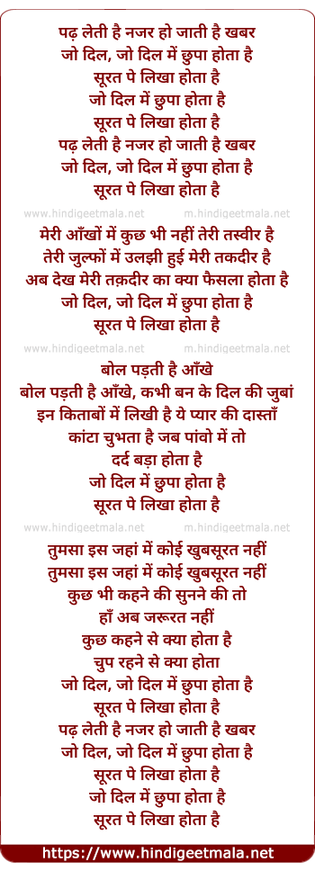 Lyrics of Padh Leti Hai Nazar Ho Jati Hai Khabar - पढ़ लेती है नजर हो जाती है खबर