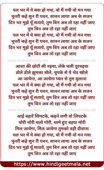 Lyrics of Pal Bhar Men Ye Kya Ho Gayaa, Vo Main Gayi Vo Man Gayaa - पल भर में ये क्या हो गया, वो मैं गयी वो मन गया