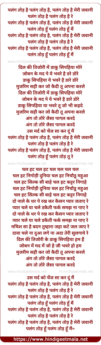 Lyrics of Palang Tod Hai Teri Jawani (Remix) - पलंग तोड़ है पलंग तोड़ है, पलंग तोड़ है मेरी जवानी