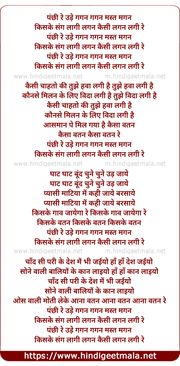 Lyrics of Panchhi Re Udde Gagan Gagan Mast Magan - पंछी रे उड़े गगन गगन मस्त मगन