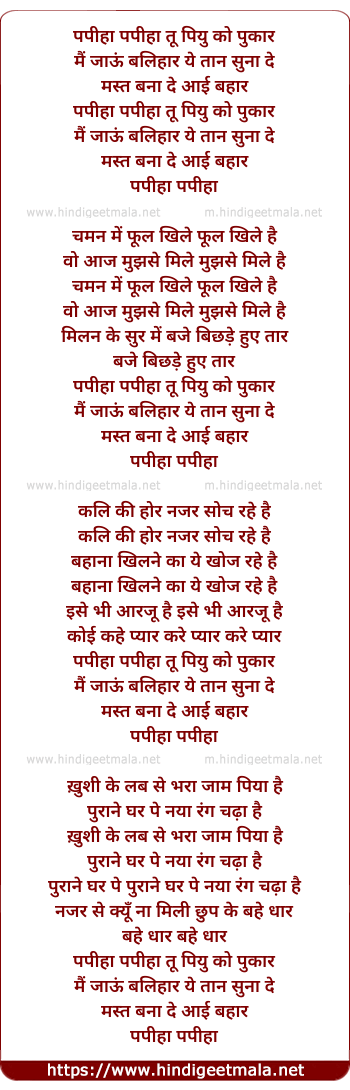 Lyrics of Papiha Tu Piyu Ko Pukar - पपीहा पपीहा तू पियु को पुकार