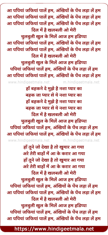 Lyrics of Aa Papiyaan Japhiyaan Paalen Ham Ankhiyon Ke Pench Lada Le Hum - आ पपियां जफियां पालें हम, अंखियों के पेंच लड़ा लें हम