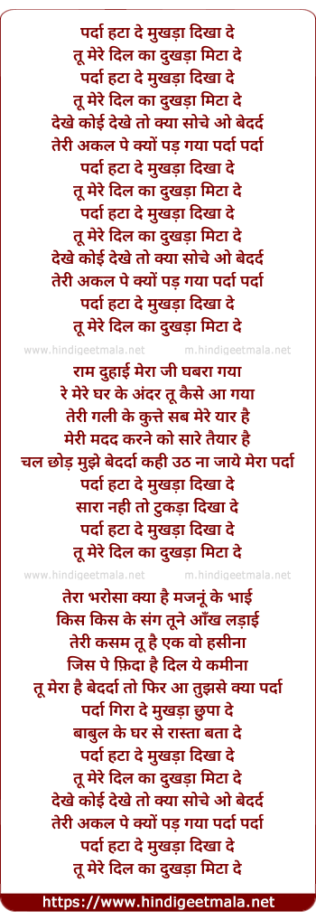 Lyrics of Parda Hata De Mukhda Dikha De - पर्दा हटा दे मुखड़ा दिखा दे