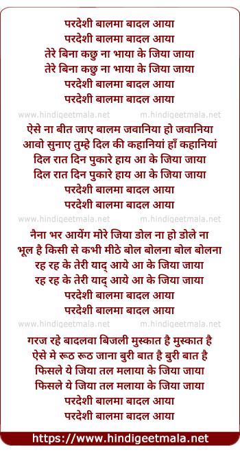 Lyrics of Pardeshi Balma Badal Aaya - परदेशी बालमा बादल आया