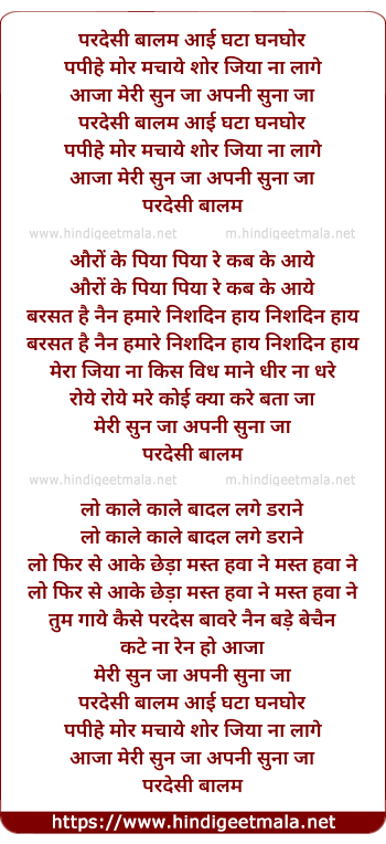 Lyrics of Pardesi Balam Aayi Ghata Ghanghor - परदेसी बालम आई घटा घनघोर