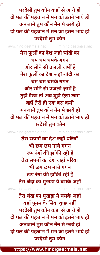 Lyrics of Pardesi Tum Kon Kaha Se Aaye Ho - परदेसी तुम कौन कहाँ से आये हो