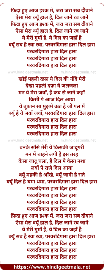 Lyrics of Parvardigaara Haara Dil Haara - पर्वर्दिगारा हारा दिल हारा