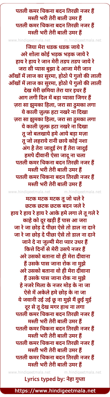 Lyrics of Patali Kamar Chikanaa Badan Tirachhi Nazar Hai - पतली कमर चिकना बदन तिरछी नजर हैं