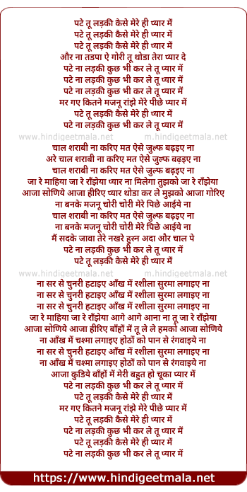 Lyrics of Pate Tu Ladki Kaise Mere Hi Pyar Me - पटे तू लड़की कैसे मेरे ही प्यार में