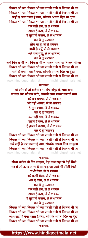 Lyrics of Nikal Bhi Ja Patli Gali Se Nikal Bhi Ja - निकल भी जा पतली गली से निकल भी जा