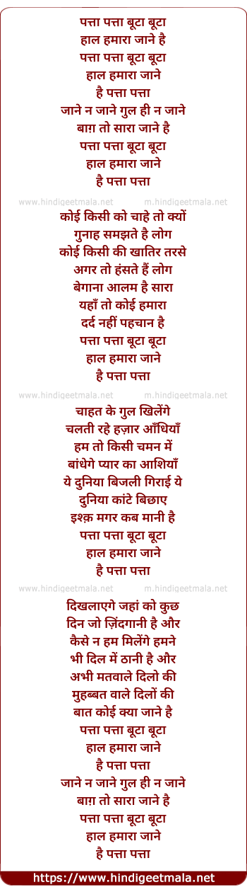 Lyrics of Patta Patta Boota Bootaa - पत्ता पत्ता बूटा बूटा